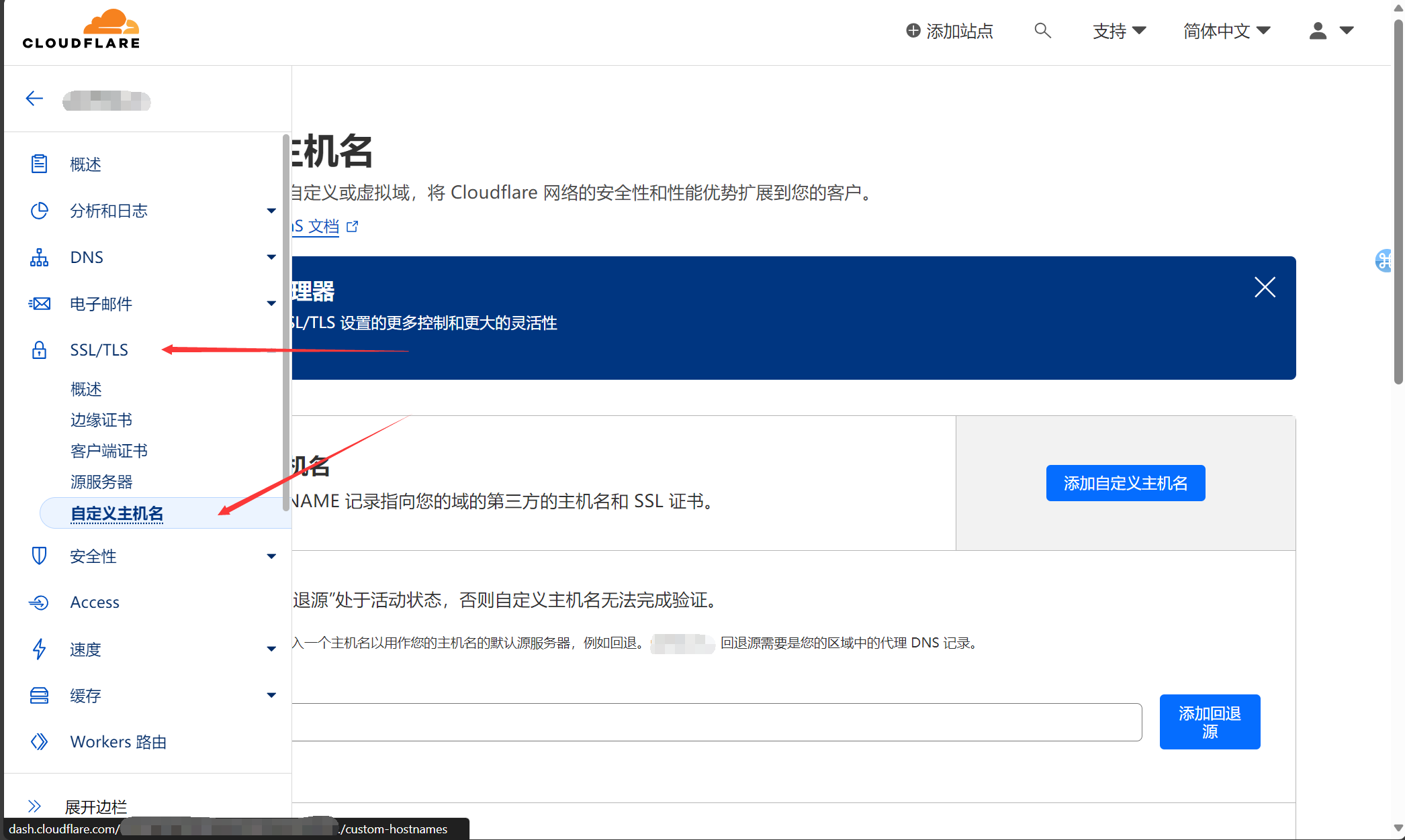 进入回退域的页面,然后点击 SSL/TLS -> 自定义主机名