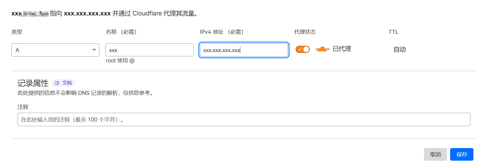 前往 DNS 选项,添加任意子域名指向默认源站,注意需要让 Cloudflare 代理此站点。
