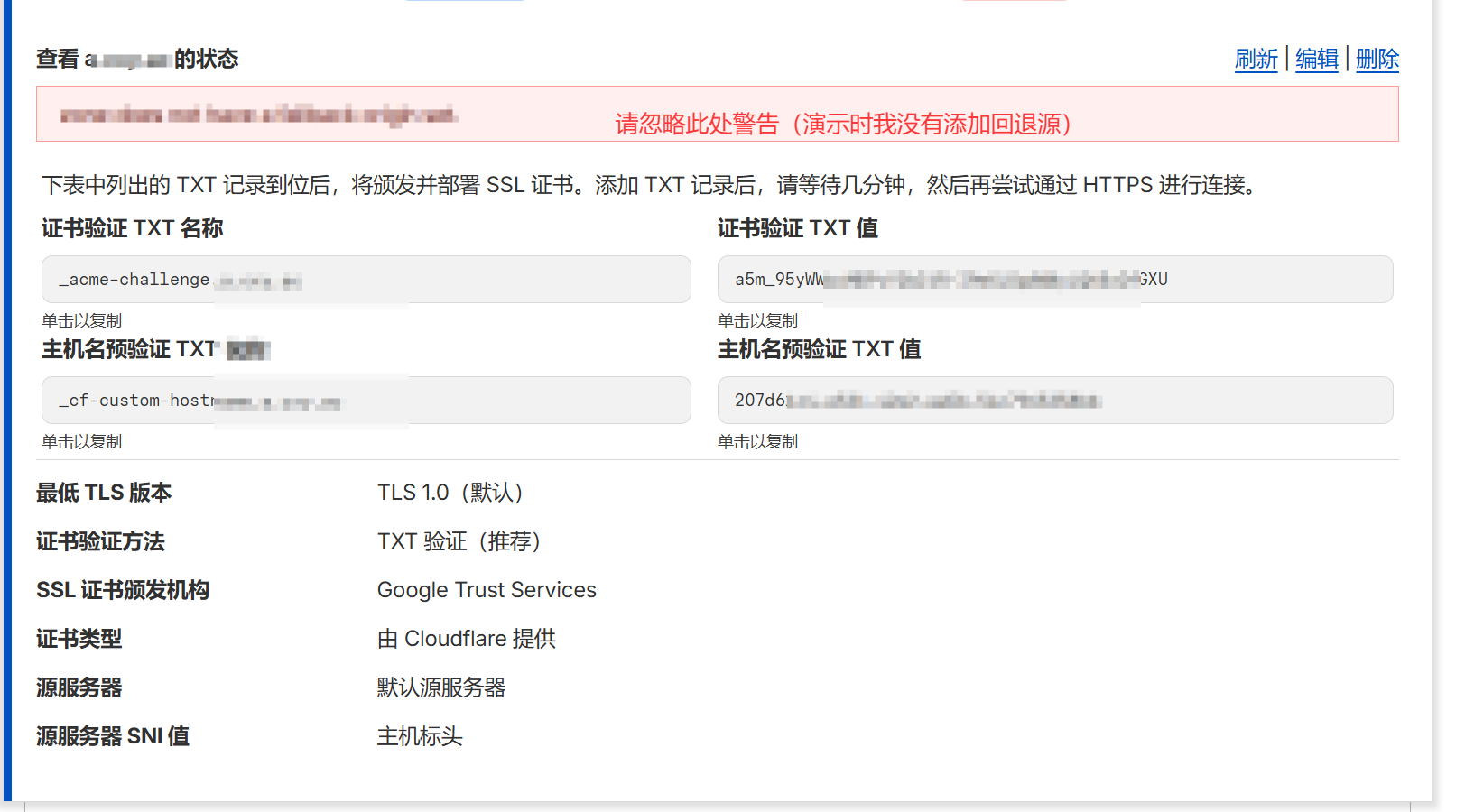 完成之后按照要求,完成自定义主机名的 TXT 验证。(当然,你也可以提前添加 DCV 委派于自定义域名)。