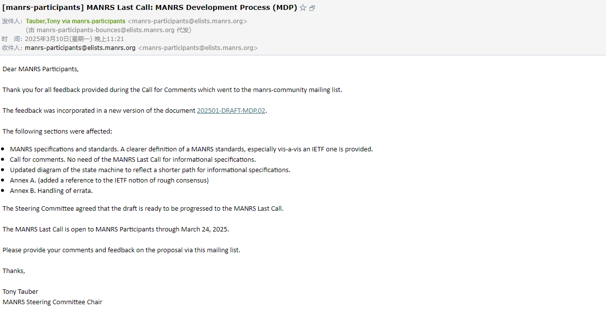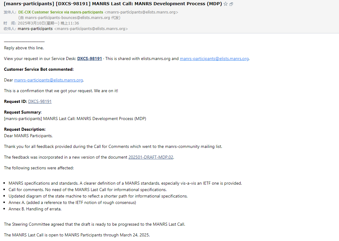 起因:MANRS 发布了 MANRS Developement 的通知邮件**“ MANRS Last Call: MANRS Development Process (MDP)** ”